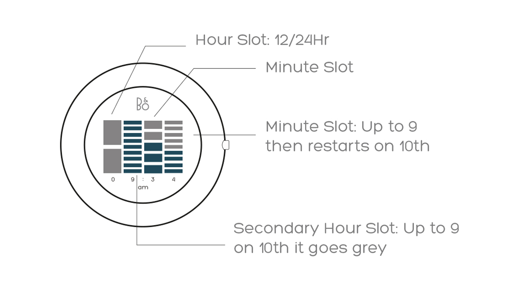 The main watch face utilises a clever method of using squares that fill up for every minute/hour goes past. This was an inspired method which was picked up after meeting those who suffer from dyscalculia, saying it helped them ‘visualise’ time. It’s an elegant & simple solution, designed to be easy to understand and read.